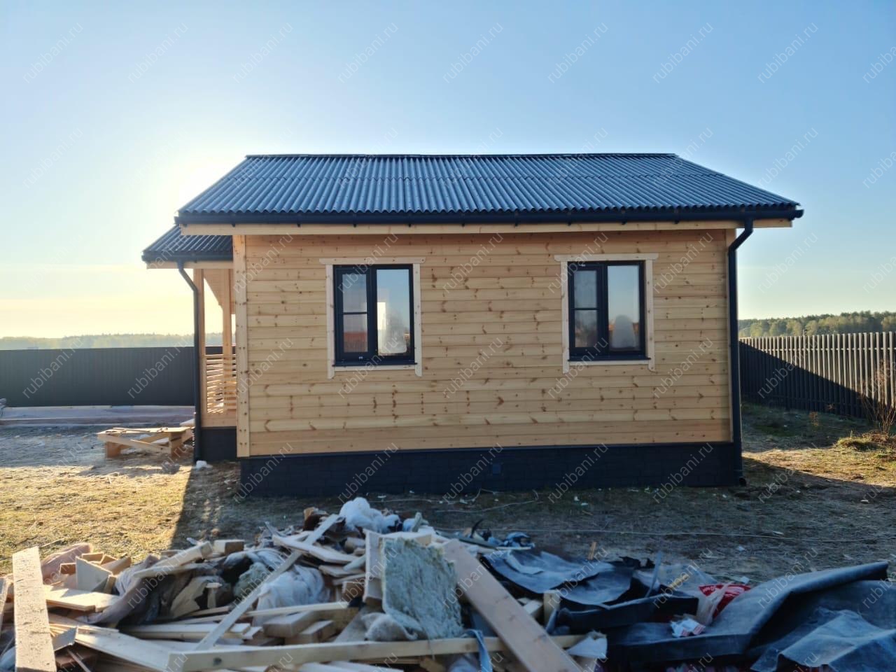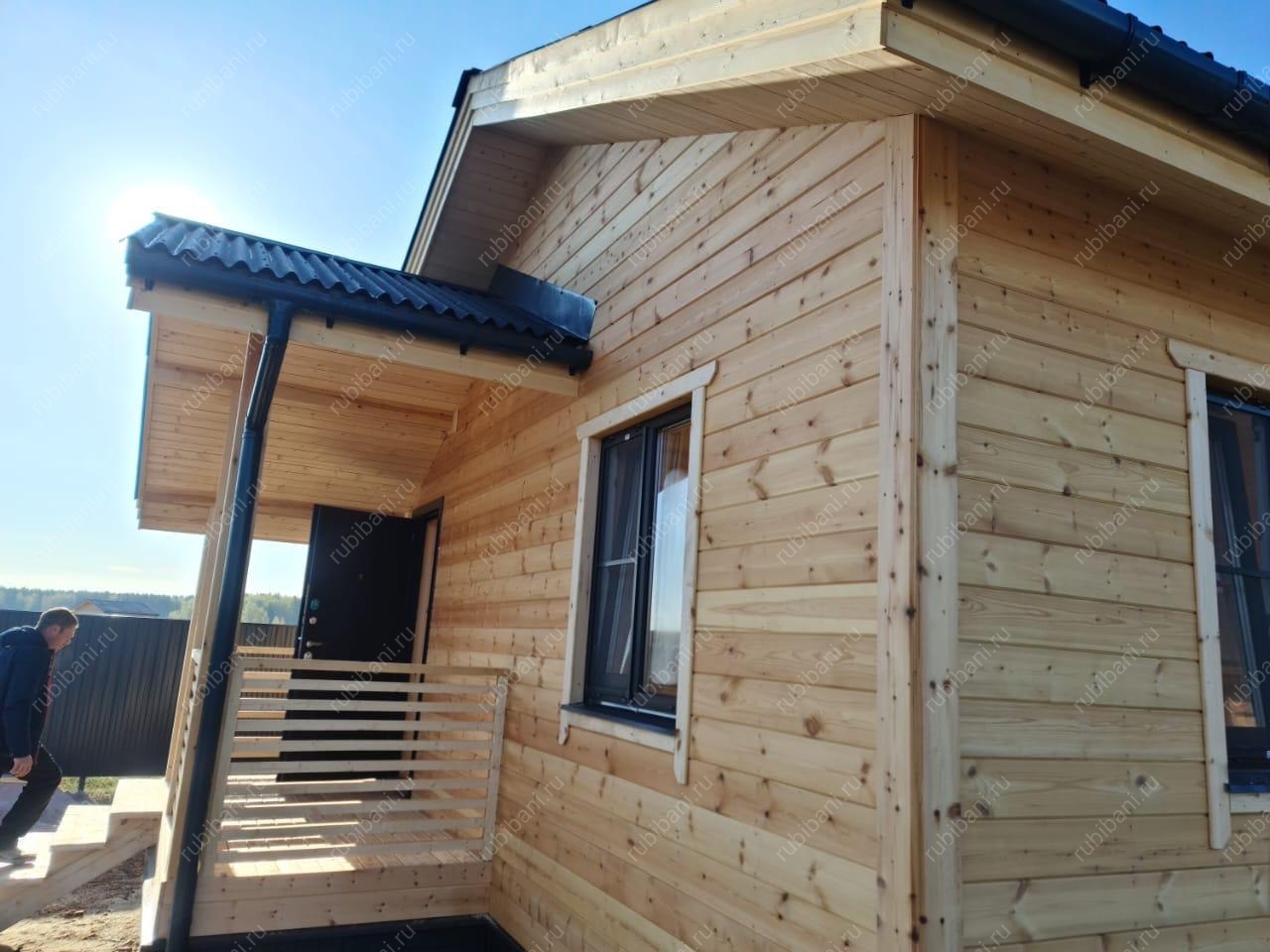 Визитной карточкой проекта стало стильное крыльцо с надежными ступенями и защитным козырьком, тщательно интегрированное в общий дизайн бани, подчеркивая качество исполнения и добавляя респектабельности фасаду.